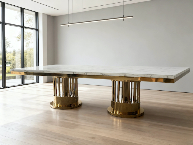 Idéal pour les grandes villas, les cuisines à aire ouverte ou les espaces d'accueil de boutique : sa taille généreuse garantit à chacun une place assise, tandis que ses matériaux haut de gamme promettent une durabilité pour les années à venir.